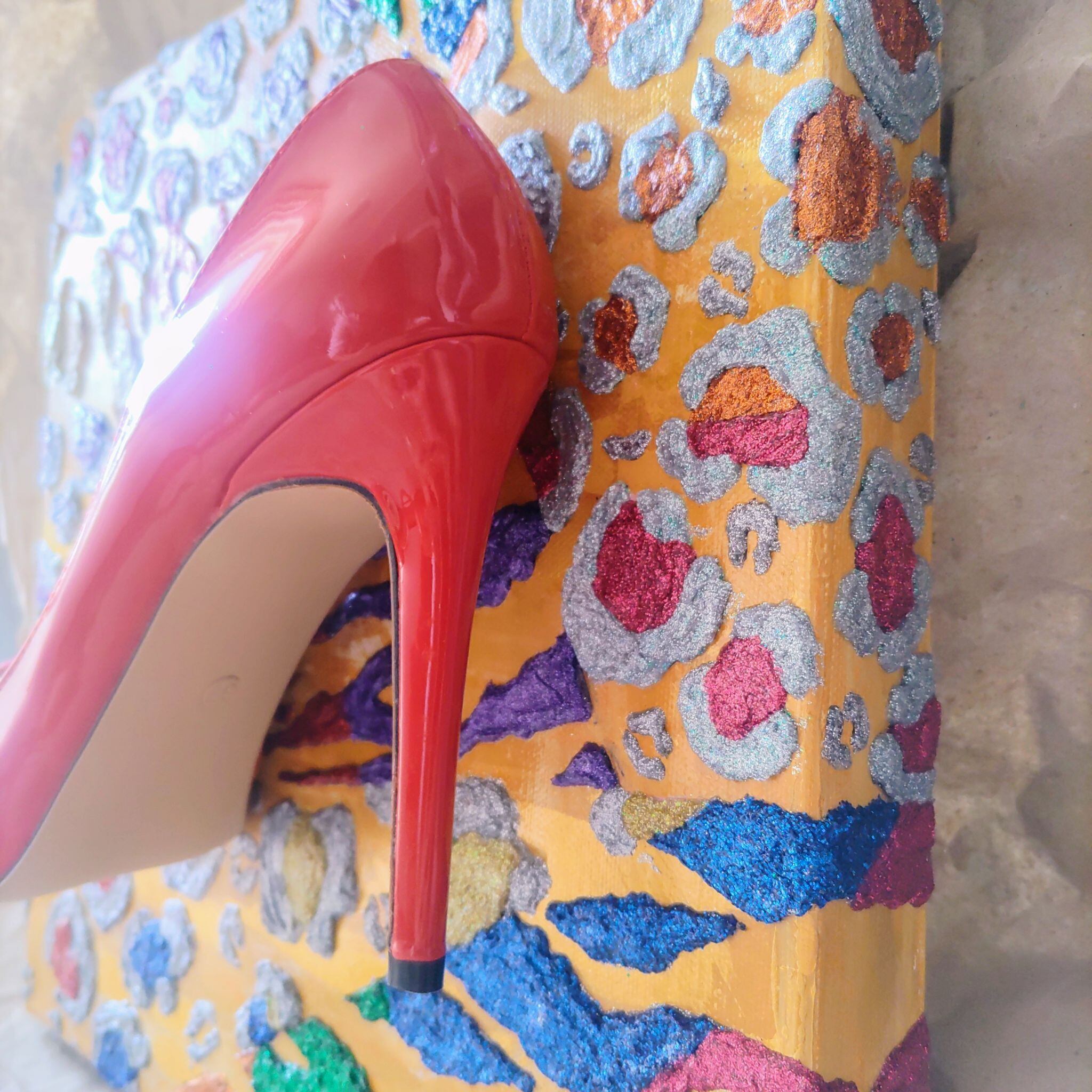 canvas, acrylic paint, heel (fake leather), medium, glitter, string, gluegum
